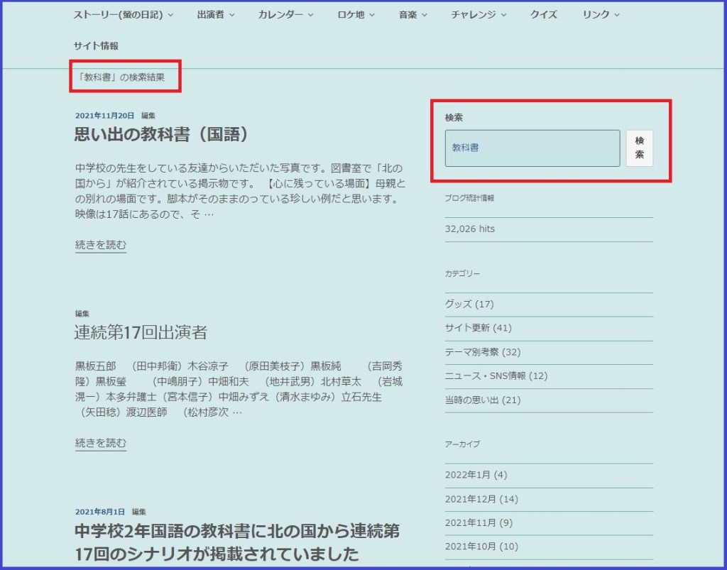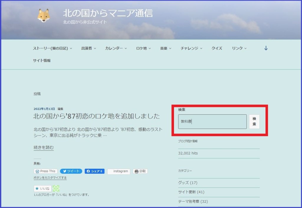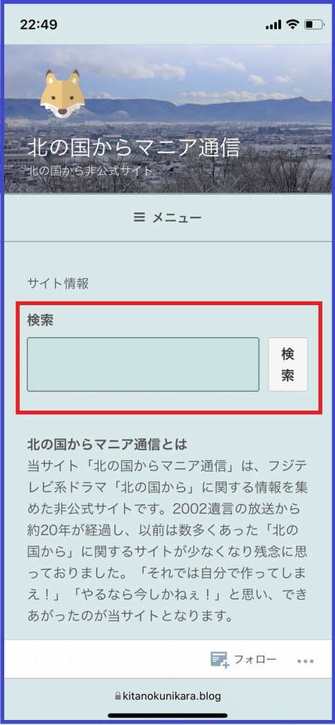 本サイト「北の国からマニア通信」を公開してから今年の2月で1年となります。サイト内容がだいぶ充実してきたので、目的の情報をすぐに見つけられるよう【検索ボックス】をサイト内に設置しました。