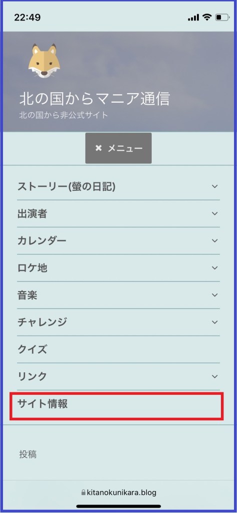 そこで、「サイト情報」のページ内にも【検索ボックス】を設けました。下の画像のように「メニュー」→「サイト情報」と選択していくと、【検索ボックス】を表示することができます。