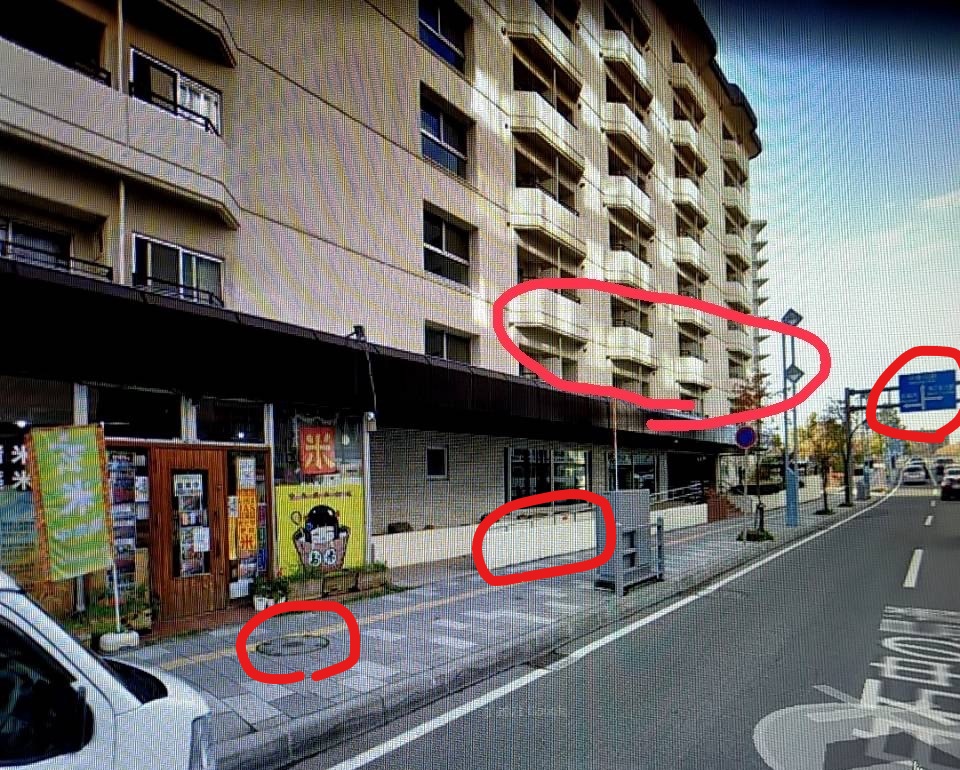 シュウさんが第一発見!幌平橋付近の様子、マンションの塀やバルコニー、道路の看板、マンホールの位置などが一致してます。