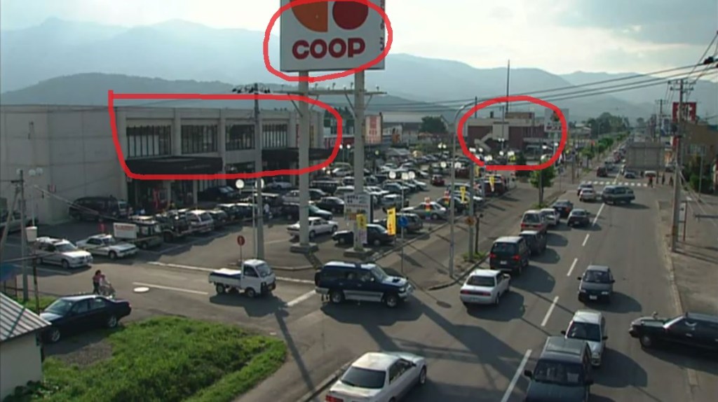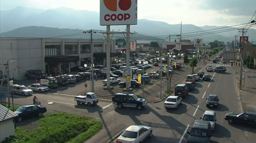 コープさっぽろ富良野店 ’98時代。お盆休みに人があふれているスーパーの駐車場の様子。