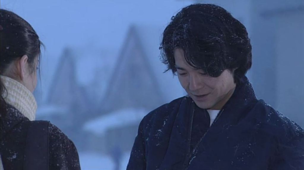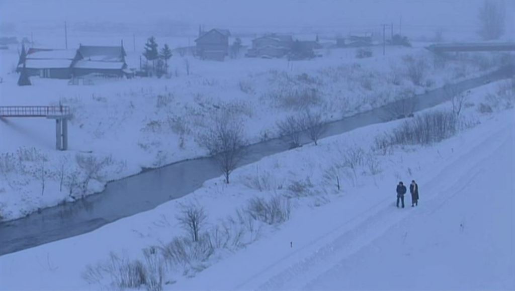 シナリオ本では「焼肉屋」と記載されていますが、映像では下の画像のとおり雪の中の土手になっています。また、クリスマスソングからシュウのテーマにも変更されています。