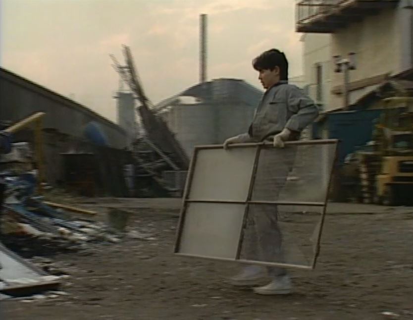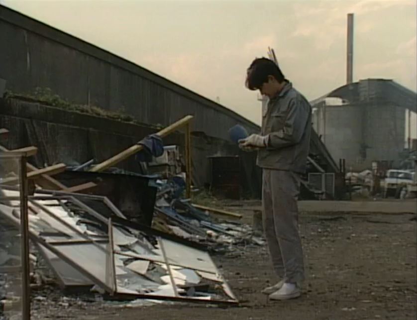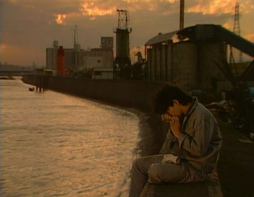 隅田川沿いの工場 ’89帰郷。以前の職場の前にある隅田川の護岸に座る純。語「どれも雑用で長つづきしなかったけど、中卒でも仕事は結構見つかった」