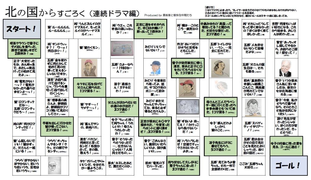 「黒板家と愉快な仲間たち」によるアイデアを取りまとめ、そらちさんが「北の国からすごろく(連続ドラマ編)」を作りました。