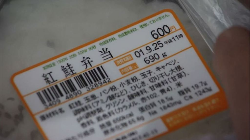 純は店の外に出て、弁当の賞味期限を確認します。「消費期限01.9.25午後11時」の文字が確認できます。純は3日前の弁当を買ってたんでしょうか??