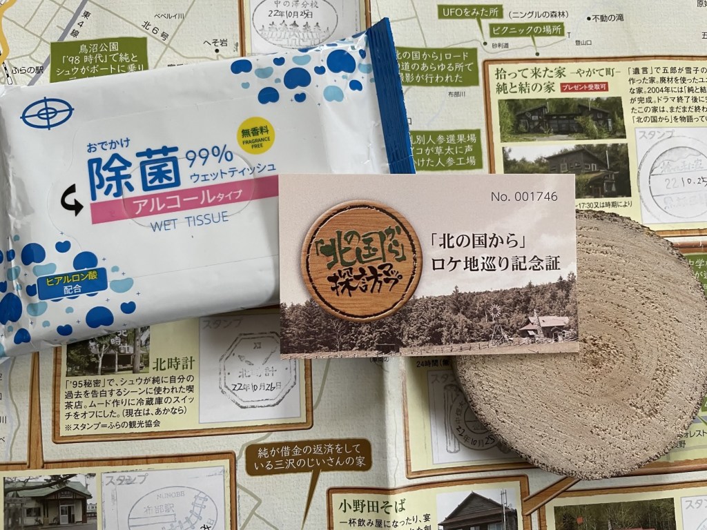 「北の国から」ロケ地巡り記念証、丸太コースター(富良野産白樺の木)、除菌ティッシュをいただきました❣️