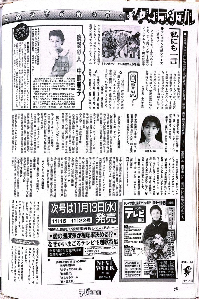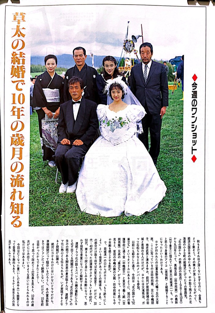 投稿日: 2023年1月29日 投稿者: JJ週間テレビ番組1991年11/9→11/15 北の国から’92巣立ちのロケの様子が紹介されています。 表紙の人 中嶋朋子 P6 今週のワンショット 北の国から関係の記事はこの1枚になります。 以降は北の国から出演者が掲載されている記事を中心に紹介します。 P7 目次 P13 大竹しのぶさん出演ドラマ「東京ららばい」 P17 風吹ジュンさん出演映画「無能の人」 P25 大地康雄さん出演NHK大河ドラマ「太平記」 P55 村井国夫さん出演ドラマ「あしたがあるから」 P66 NHK紅白歌合戦大予想 P67 NHK紅白歌合戦大予想 人材難!?司会者陣、話題性で選ぶなら宮沢りえにビートたけし! P78 表紙の人 中嶋朋子 P81 今週のワンショット 番外編 宮沢りえさん 共有:Tweet クリックして instagram で共有 (新しいウィンドウで開きます) instagram クリックして印刷 (新しいウィンドウで開きます) 印刷 いいね 読み込み中… 関連