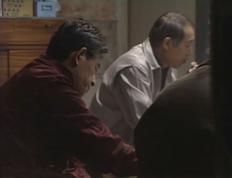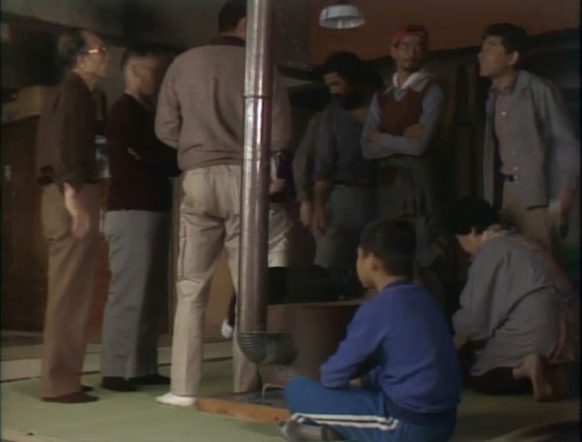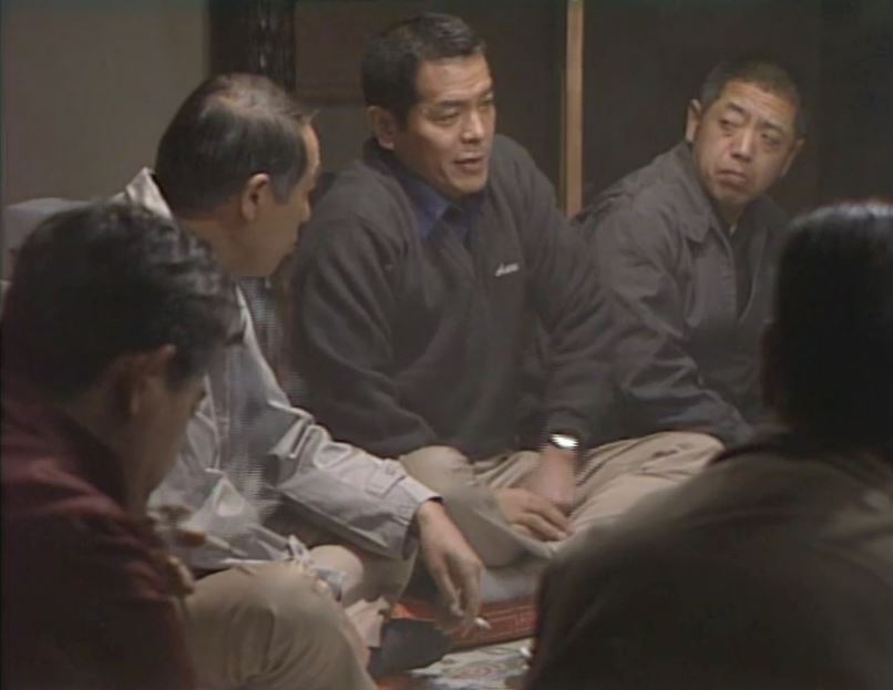北の国から’87初恋、中津の借金を連帯保証するかについて話し合っているシーンです。台詞は確認できませんでしたが、顔の特徴からエンジ色の服を着ている男性が田村元治さんと思われます。画像が粗く違っているかもしれませんので、ご意見お待ちしております。