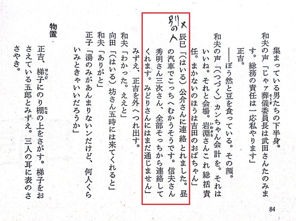 シナリオ本を見ると、辰巳の台詞になっています。理由は分かりませんが、映像では田村元治さんが演じる男性の台詞に変わっています。