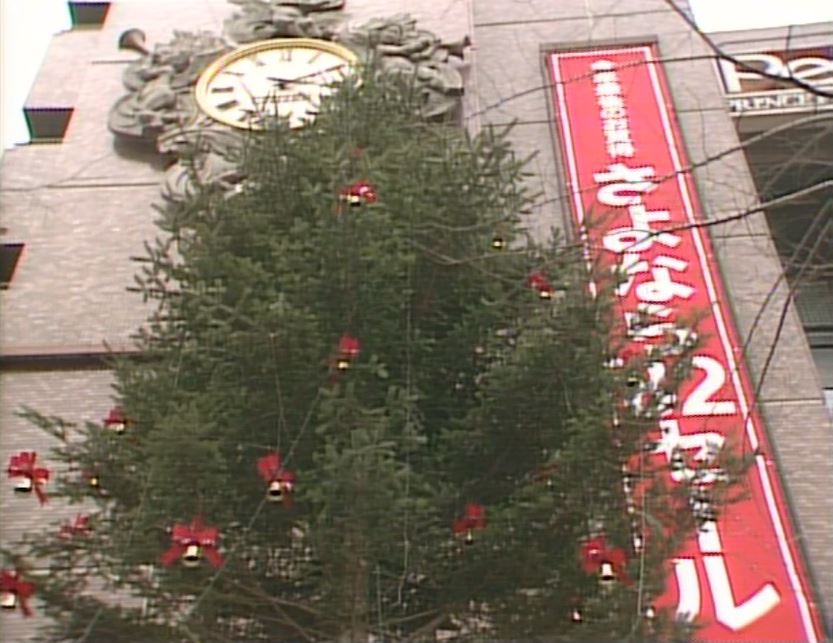 西武新宿PePe ’83冬。ドラマ映像から西武新宿PePeのクリスマスツリーや「さよなら’82セール」の懸垂幕が確認できる。