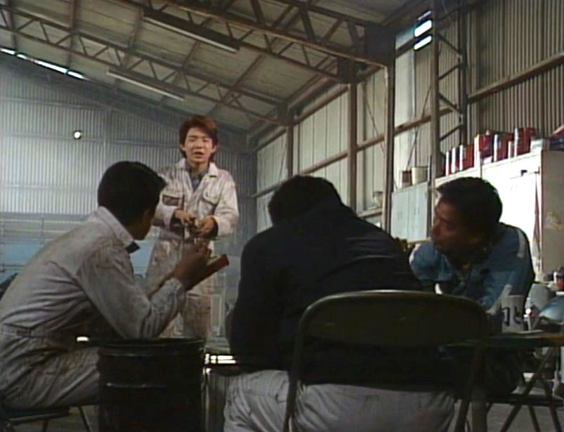 水谷を含め工員3人でご飯を食べていると、純が「だれか知りませんかこの中にあった二万」と聞きに来るシーンです。