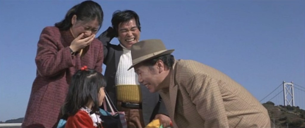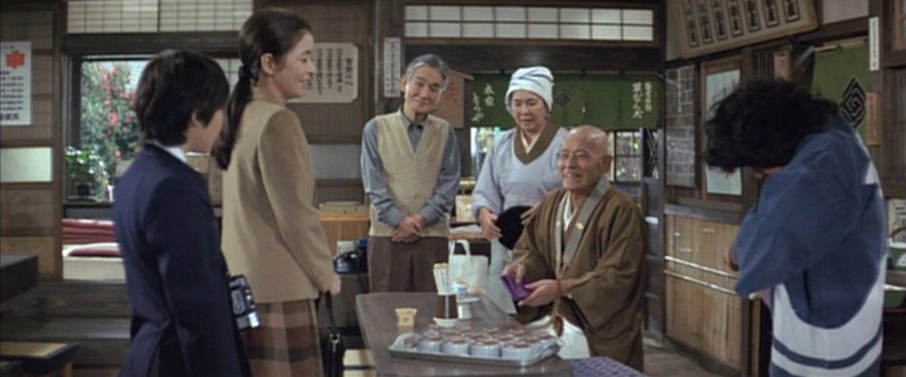 博(前田吟)の父親の三回忌に出かける満男(吉岡秀隆)とさくら(倍賞千恵子)。御前様(笠智衆)と源ちゃん(佐藤蛾次郎)も見送りにきています。