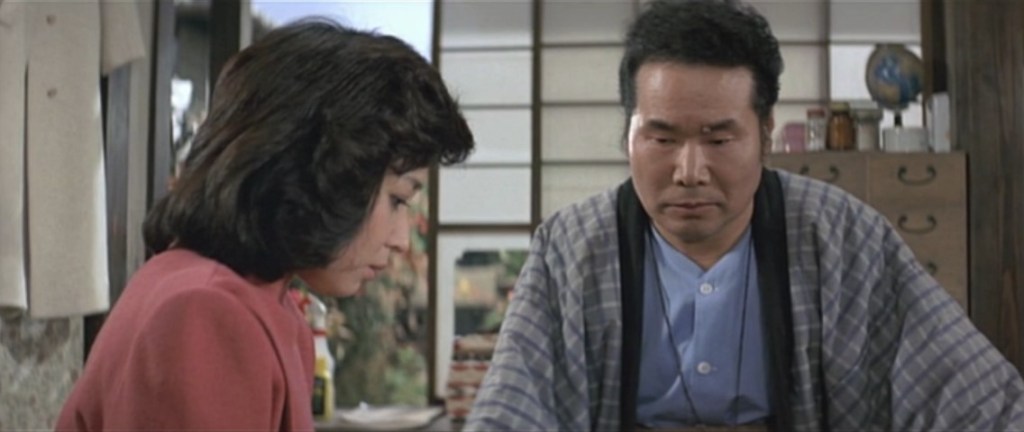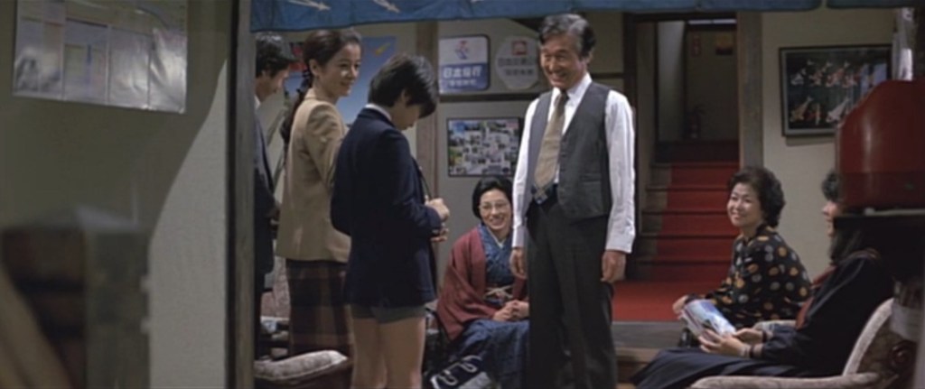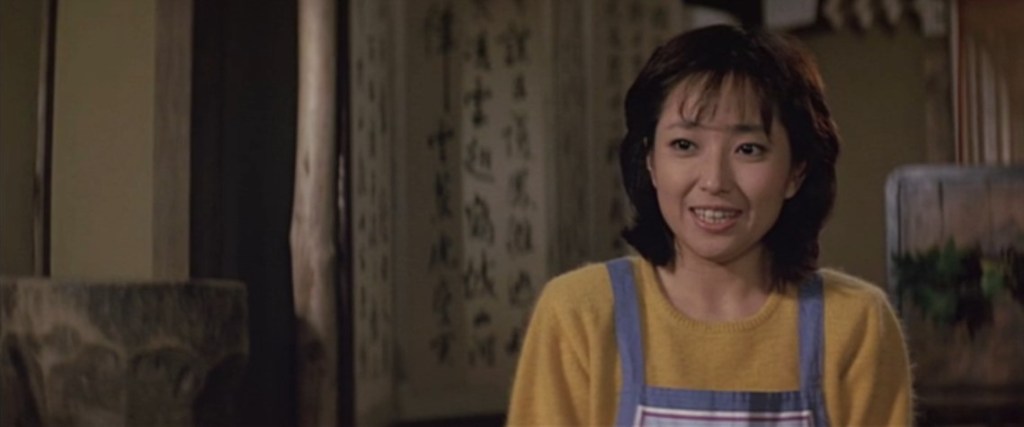 朋子(竹下景子)が御前様(笠智衆)とすれ違うシーンです。朋子の美しさに見とれてしまった御前様が自分自身に一言「いかん。修業がたりん」