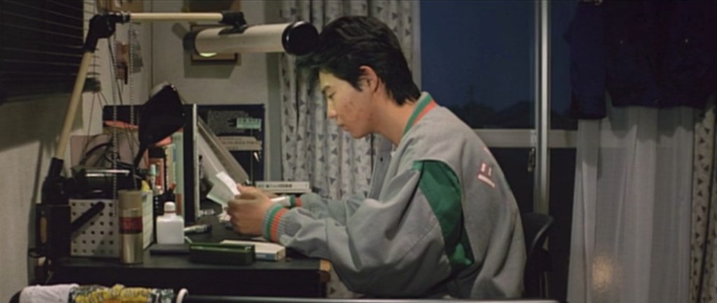 部屋で泉ちゃんからの手紙を読む満男。後ろに見えるのは、1985年(昭和60年)に発売された尾崎豊さんの12インチシングル「卒業」のアルバムジャケットです。寅さん仲間のhatakouさんに教えていただいた情報です。満男も純と同じく尾崎豊ファンのようです。