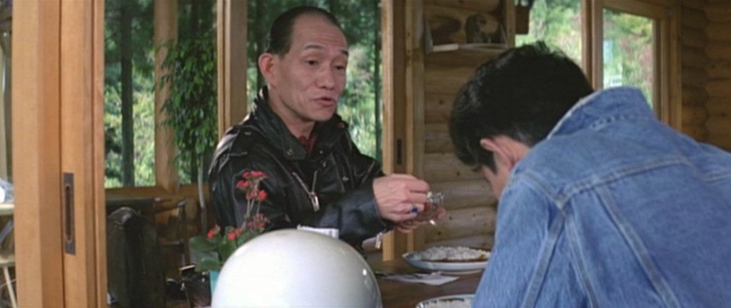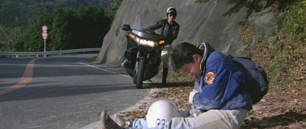 途中の山道で転倒してしまう満男。助けに来たのはライダーの笹野高史さん。サングラスをかけてかっこよくきまってます!