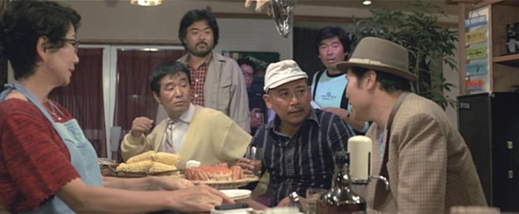 BBQを楽しむ中、順吉(三船敏郎)とスナックママ・悦子(淡路恵子)の仲を取り持つ寅さん