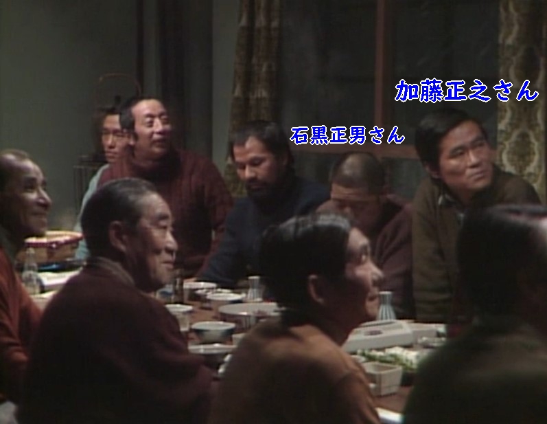 出演者調査第27弾では、クマさんの隣に座っている坊主頭の宴席参加1(石黒正男)を紹介しました。同様に本サイトの’83冬出演者のページでは、宴席参加2(加藤正之)と表記することとしました。俳優さんの出演シーンが判明した順に便宜上数字をつけています。