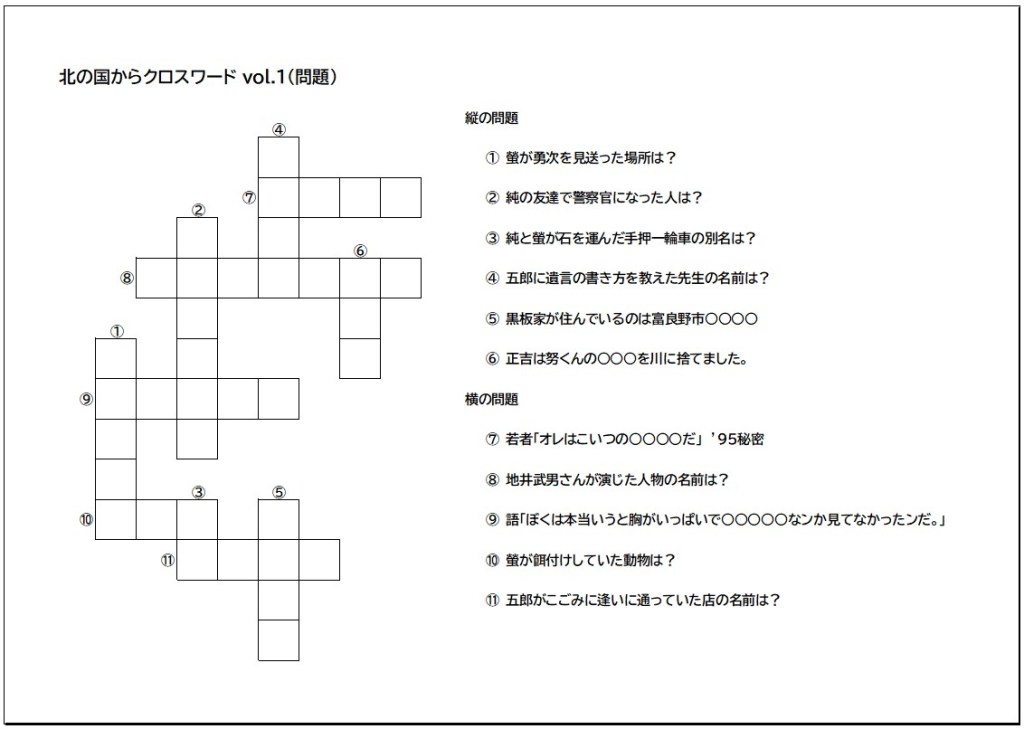 突然ですが、北の国からクロスワードを作ってみました。北の国から界隈で「えなりくん」と呼ばれている@おろちんさんのクイズ企画からヒントを得ました(^^ゞ