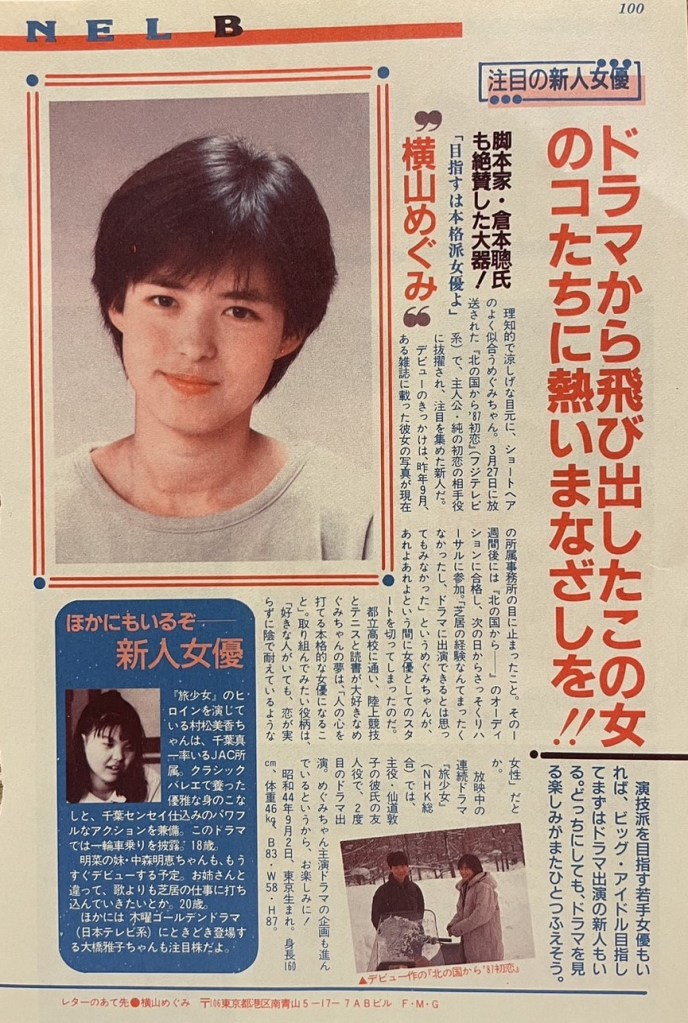 横山めぐみさんが掲載されていた雑誌を紹介します。切り抜きを手に入れたため掲載雑誌は不明ですが、北の国から’87初恋の放送前後に発売されたものと思われます。