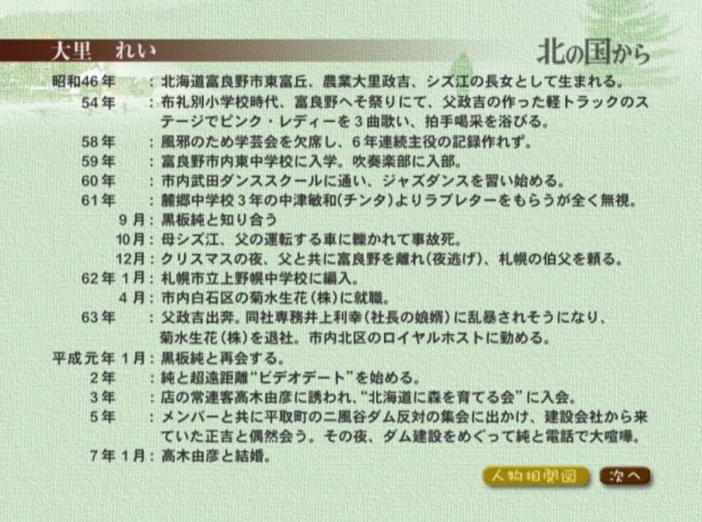 久しぶりにDVD「北の国から~The Inside StoryⅡ~」を見直してみました。大里れいの履歴書を見ると、今まで知らなかった驚きの情報がありました( ゚Д゚)この情報を元にサイトを更新しました。