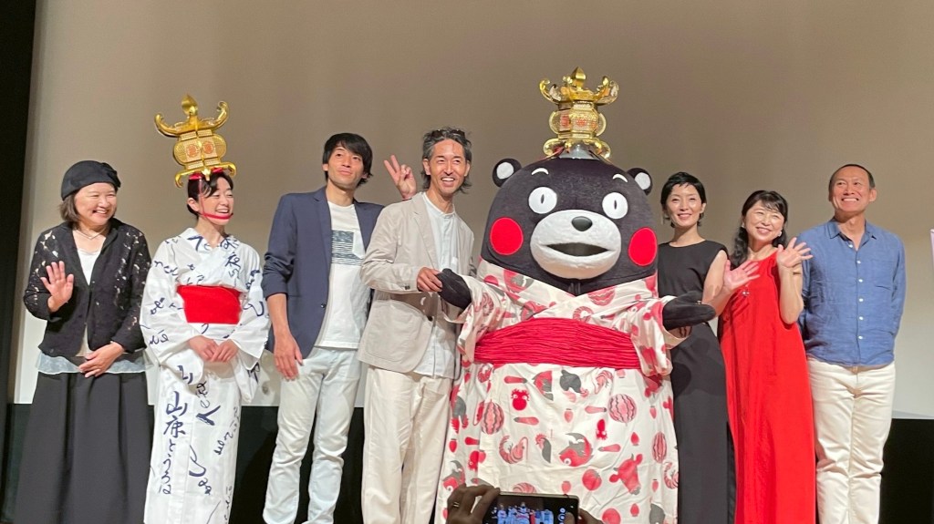 写真左から、木庭撫子監督、知江崎ハルカさん、高山洋平さん、水津聡さん、くまモン、まひろ玲希さん、たむらもとこさん、にしやうち良さんです。