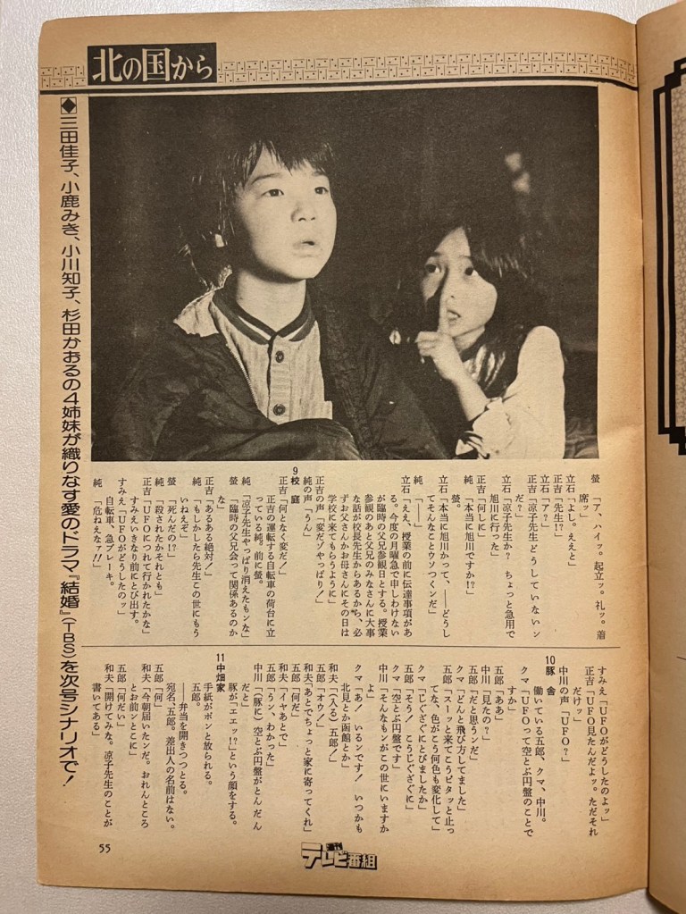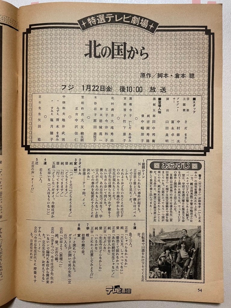 8月のフジテレビの連続ドラマ再放送に始まり、全国各地で北の国からが再放送されているようです。今回は1982年(昭和57年)1月22日(金)、北の国から連続ドラマ第15回放送日の週に発売されたテレビ雑誌の紹介をします。