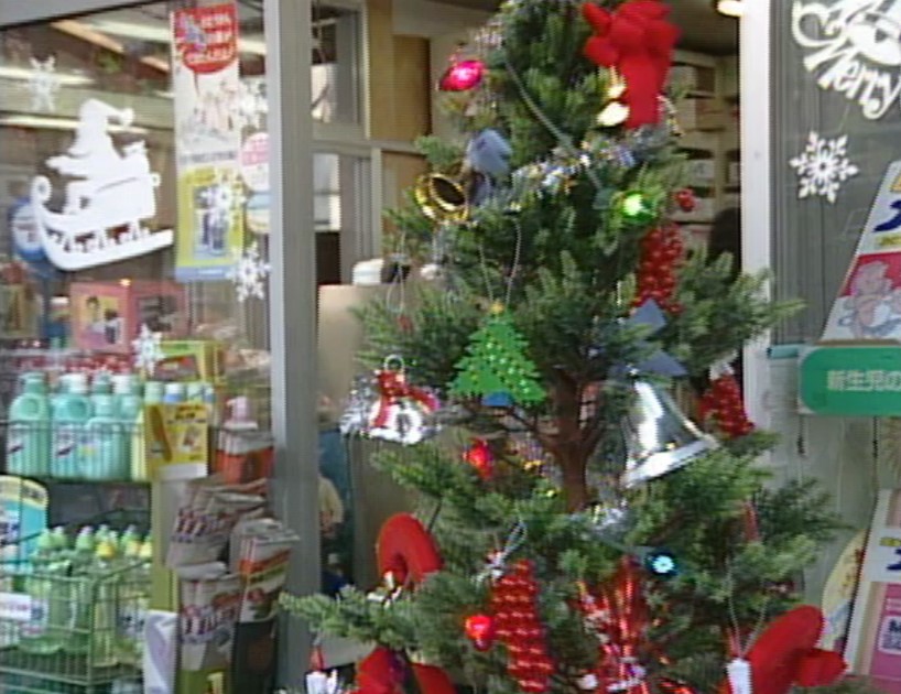 🎄’89帰郷…一万円札を探す純とエリちゃん。薬屋の前にクリスマスツリーが飾られている。