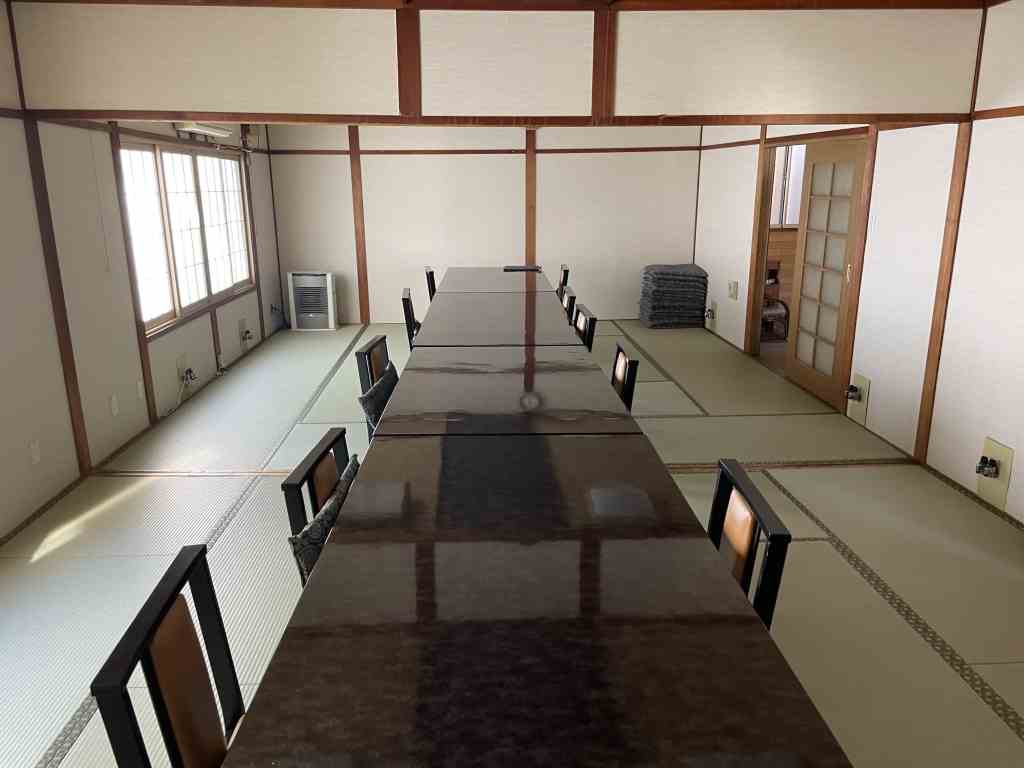 「カッポレ!カッポレ!」と宴会がおこなれた場所は2階にあります。お店の方のご厚意で部屋の写真を撮らせていただきました。ちなみに金屏風はお店にないそうで、どこかから借りてきたようです。