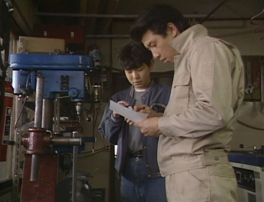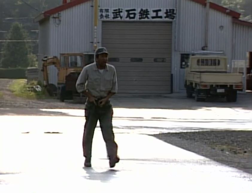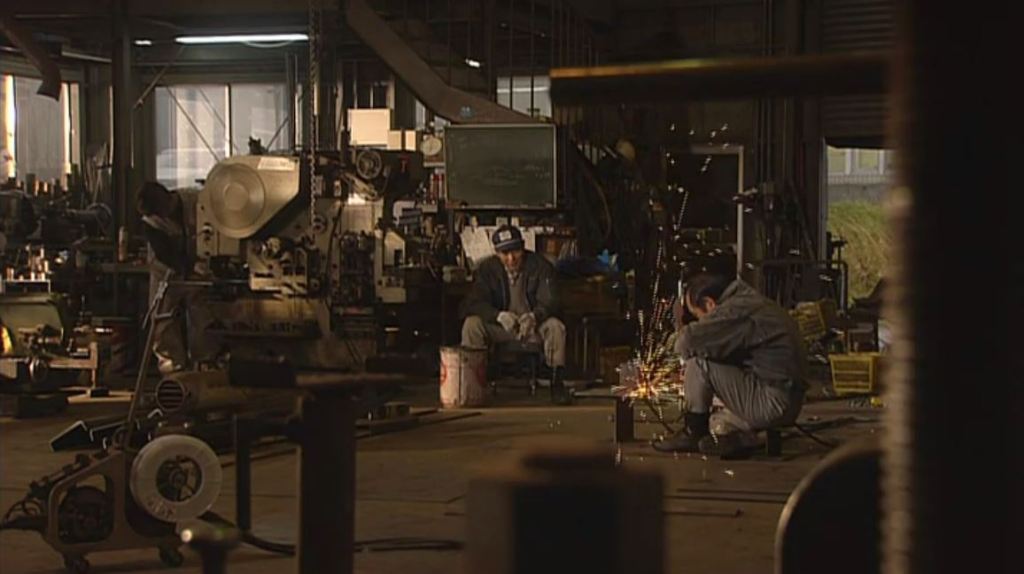 武石鉄工場 ’92巣立ち。前編では、五郎が金次の作業場に歩いて行くシーンの後ろに建物が見えた。後編では、五郎は武石さんに図面を見せ、やぐら作りの相談をしていた。