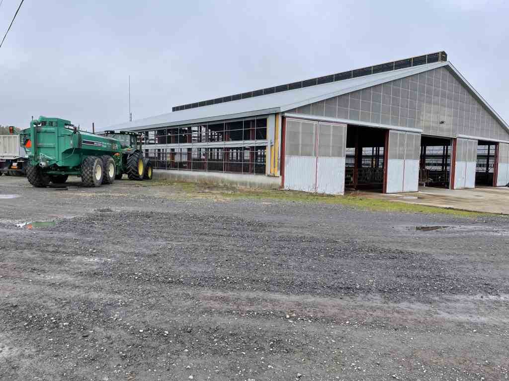 牛舎の中に牛がたくさんおり、忙しそうに人が出入りしていました。