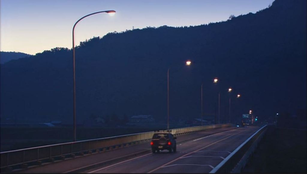 ’95秘密、明け方、シュウのアパートから帰る純が車で走った。