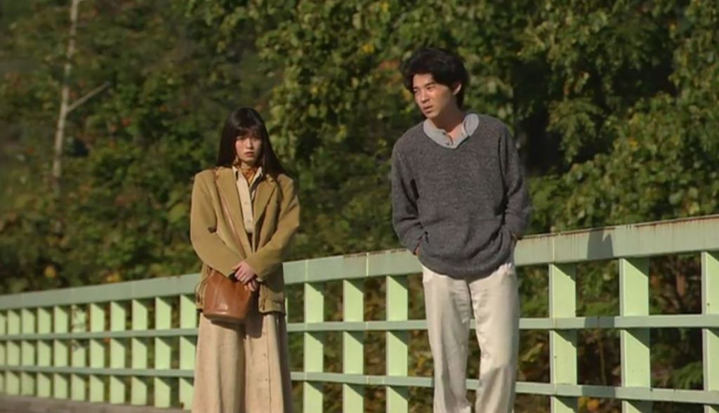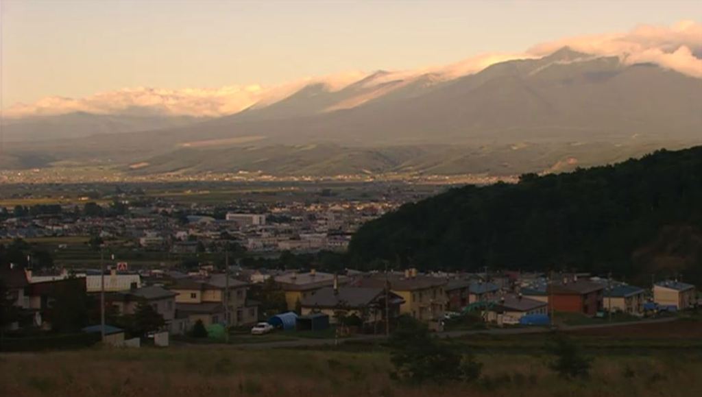 ①’87初恋、純・広介・チンタがれいちゃんを見に町へ下りる前に映る町の全景にふらの五条大橋が見える。