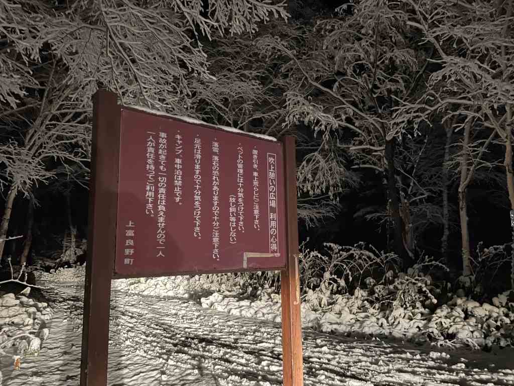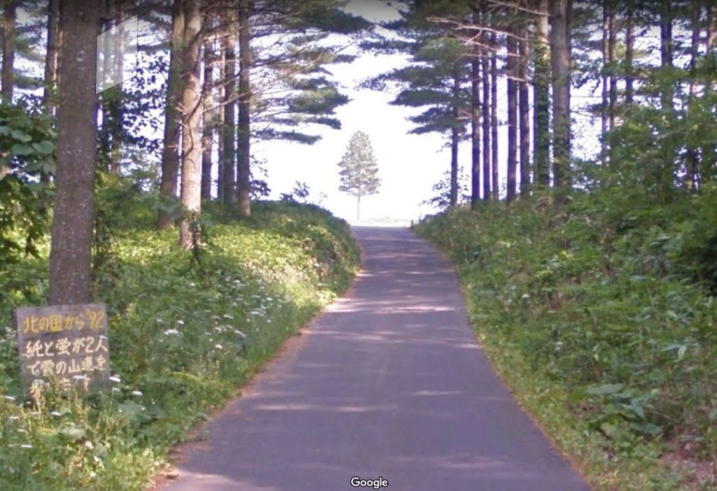 純と螢が歩いた所 ’92巣立ち。「純と螢が2人で雪の山道を歩いた所」の看板が立っている。五郎が助かった後、棟梁のいる現場に向かう途中のシーンで登場する。※2022年10月、以前はあった看板がなくなっていた。