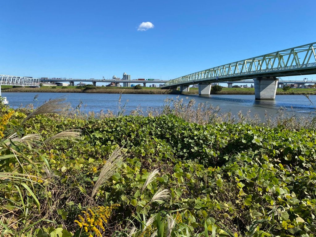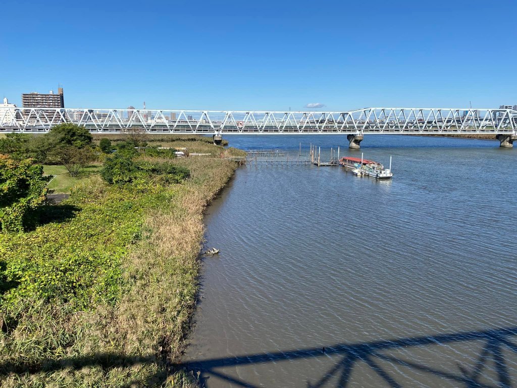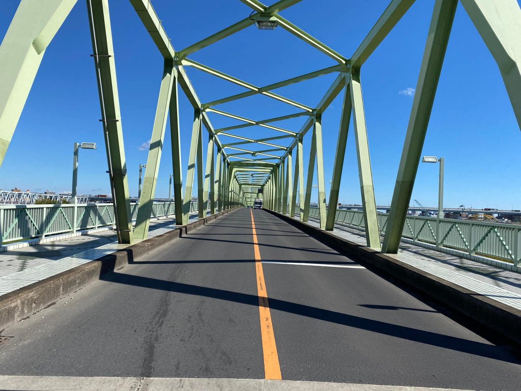 荒川に架かる都内の橋では珍しい片側一車線。どこか牧歌的な雰囲気が漂う橋です。