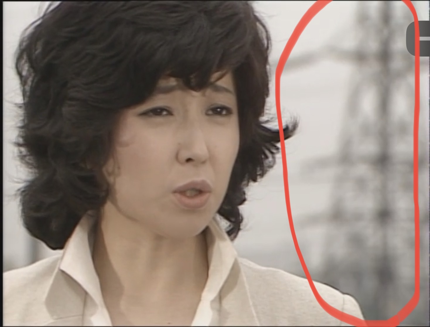 雪子の後ろに見える送電線鉄塔