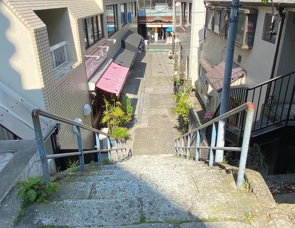 純たちがいた階段上から見た曙橋商店街です。ドラマ映像(3枚目)と今の現地写真(4枚目)になります。