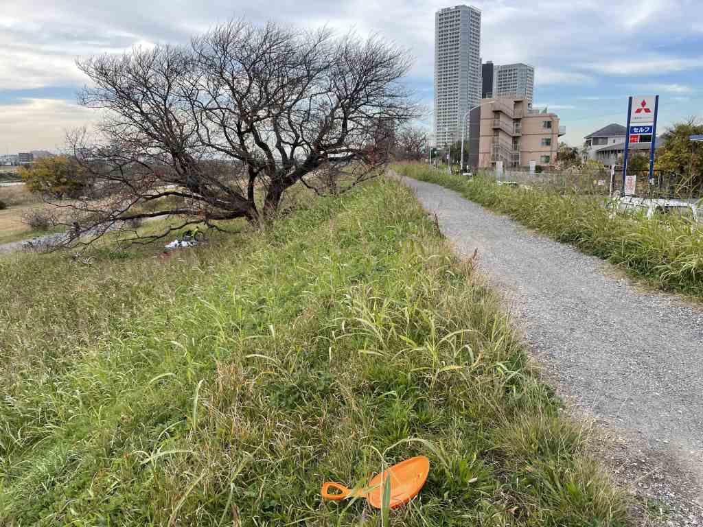 次にコウタさんと合流し、二子玉川駅から徒歩15分くらいのところにある自動車整備工場跡地とその前の多摩川土手に行きました。