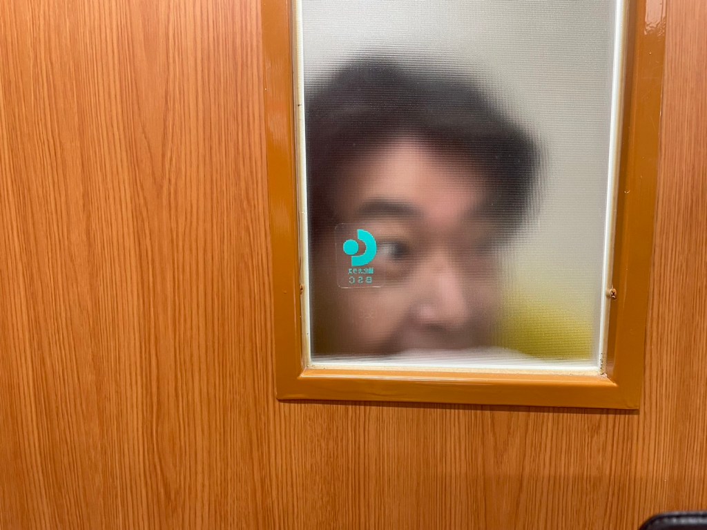 窓から英語塾の中ををのぞく純です。迫真の表情です。
