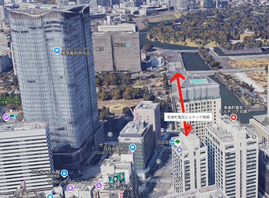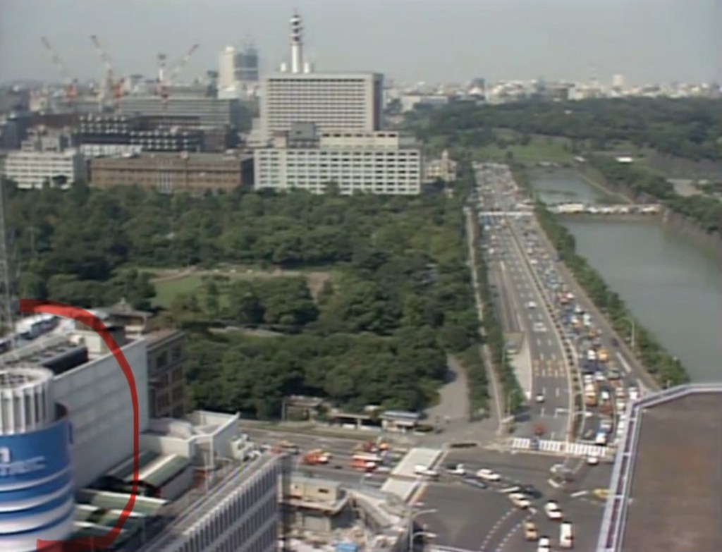 コウタさんからは、北の国からの映像に東宝ツインタワービル(地上9階・1969年竣工2020年解体)の青い丸看板が映り込んでいることを教えていただきました。現在の東宝日比谷プロムナードビルの場所になります。下画像の赤○