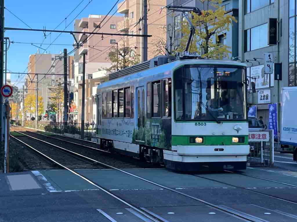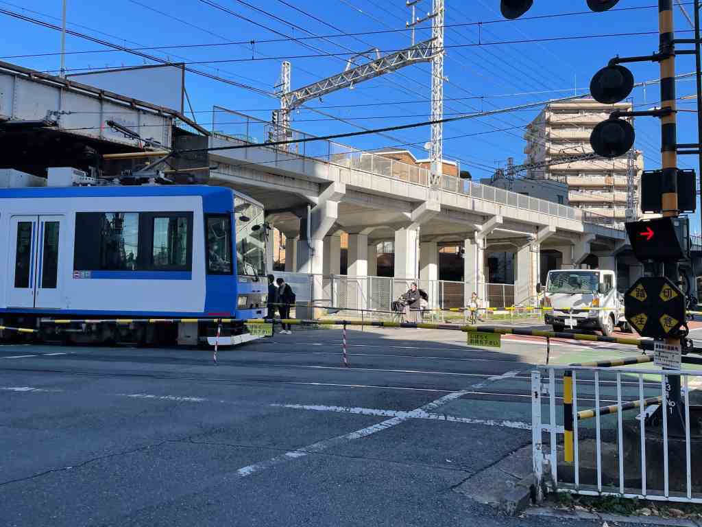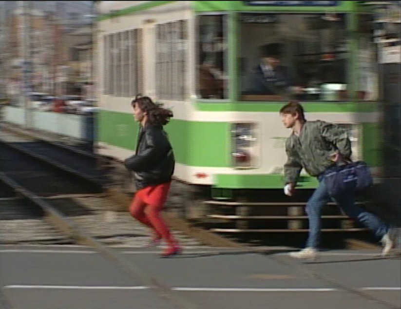 町屋駅前の都電荒川線 ’89帰郷。一万円札を探す純とエリが都電荒川線の線路を渡る。2人が渡るのを都電荒川線の車両が待っていた。