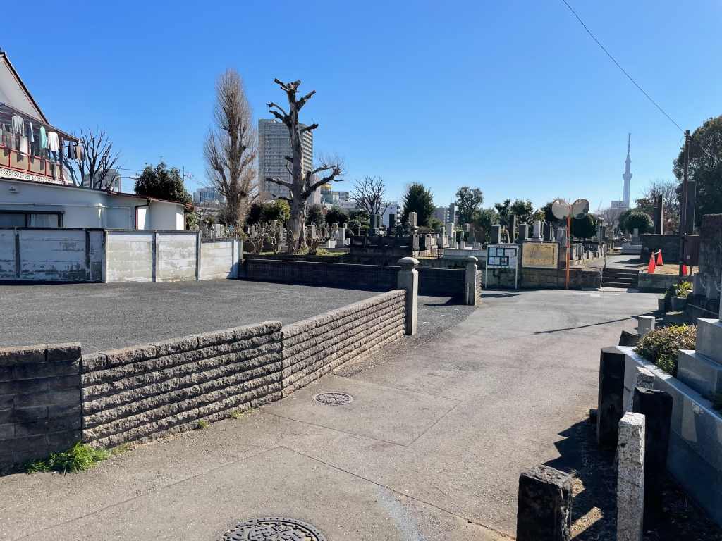 アカマンのアパートは取り壊され、現在は駐車場になっていました。奥に見える掲示板とカーブミラーは残っていました。この日は天気が良く、その向こう側には東京スカイツリーが見えました。