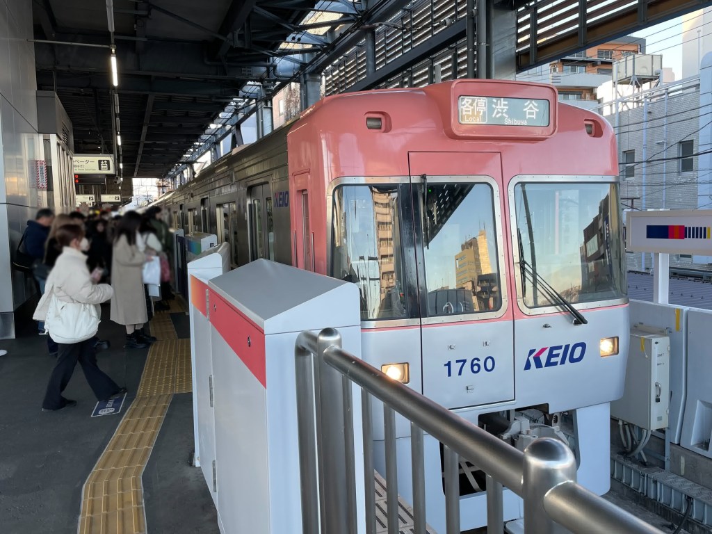 ドラマと同じ京王井の頭線渋谷行きのホームで列車を撮影しました。当時と同じようなピンク色を基調としたデザインの列車でした。