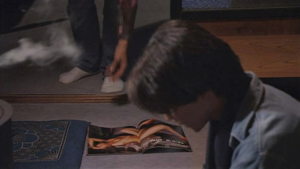 純とれいちゃんは毎週土曜日の8時、一緒に映画を見て感動を共有し合っていました。その後の語り「そのデイトにもそろそろ飽きがきてたンだ」のシーンで純の部屋の天井に貼ってあるヌードポスターが映ります。シナリオ本では「壁に貼られたボインのポスター」と書かれています。