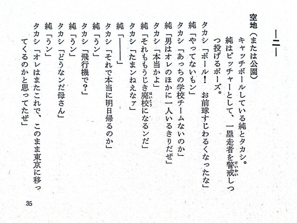 ・東京に戻った純がタカシとキャッチボール※シナリオ本のみ記載(連続ドラマ第14回)